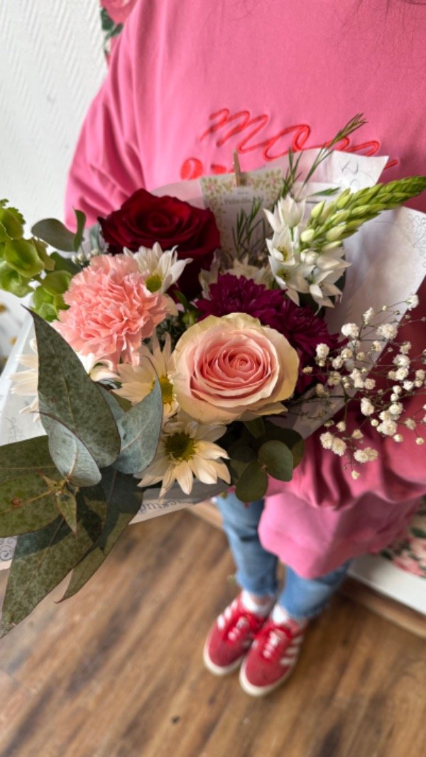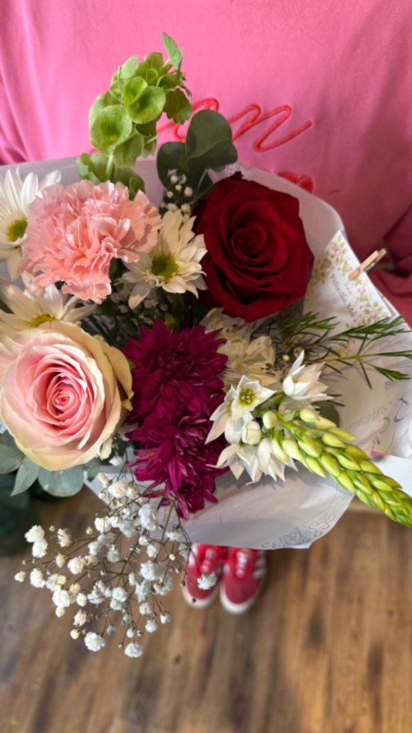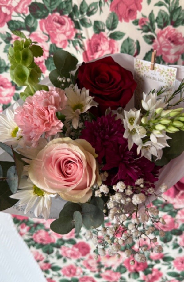 2 rosas importadas, ornithogalum, san Vicentes, alstroemerias, margaritas, macetillas, craspedia, moluccella, eucalipto, cera, gypsophila.