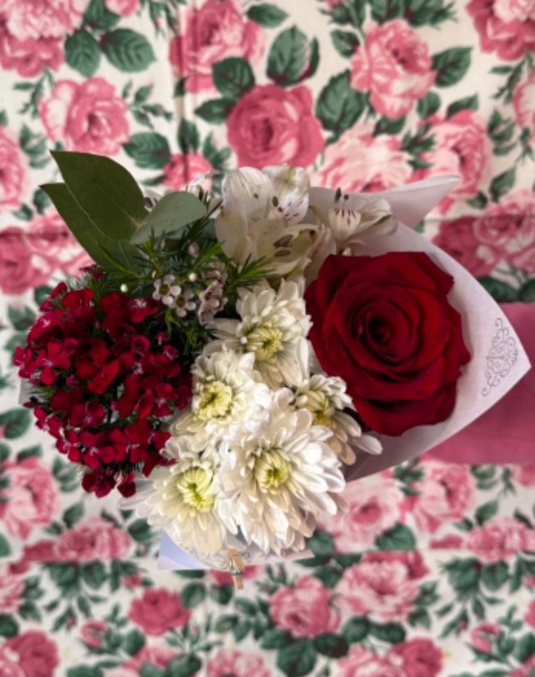 1 rosa importada, margaritas, macetilla, alstroemerias, cera, clavel, pompon, gypsophila, eucalipto.